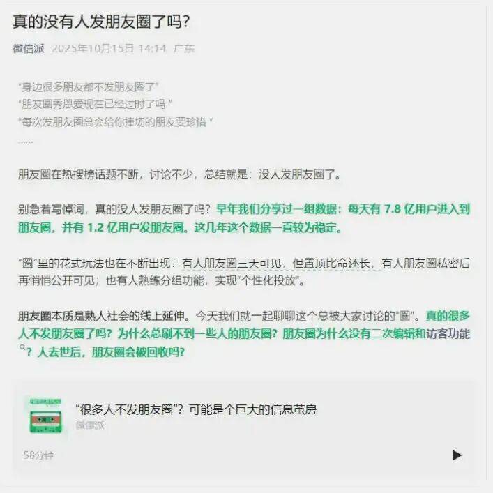 在腾讯 2025 年第二季度财报里,微信及 WeChat 合并月活账户数 14.11 亿。那么每天进朋友圈的用户7.8 亿,每天发朋友圈的用户1.2 亿。